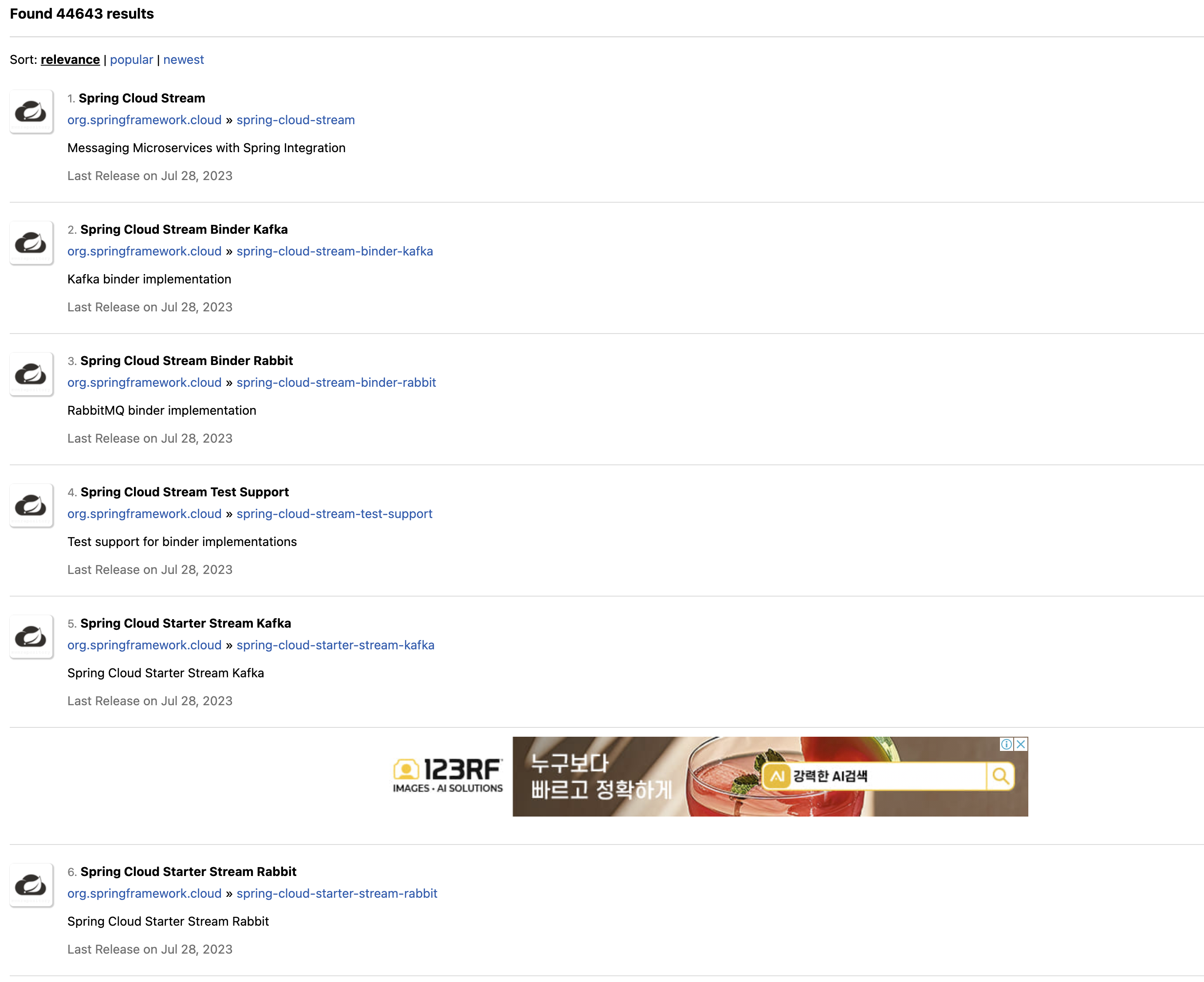 MVN Repository 접속 후 Spring cloud stream 을 검색